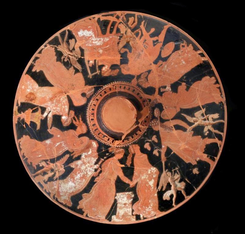 | Διονυσιακή σκηνή εννέα Μαινάδες, ένας Σάτυρος και πέντε μικροί Έρωτες μεθούν, χορεύουν και παίζουν μουσική γύρω από τον θεό Διόνυσο. 4ος αι. π.Χ. |
